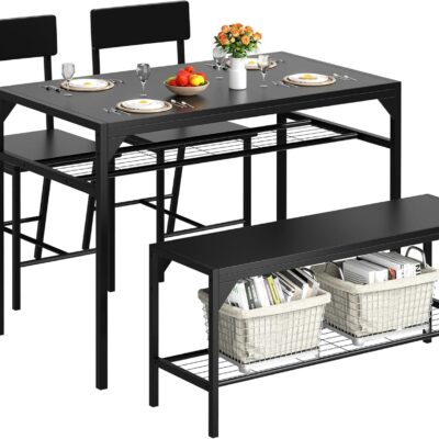Shintenchi Kitchen Table Chairs Set of 4, Dining Table Set for 4 with Bench and Chairs, 4 Pieces Kitchen Table Set with Storage Rack & Metal Frame for Small Space, Black