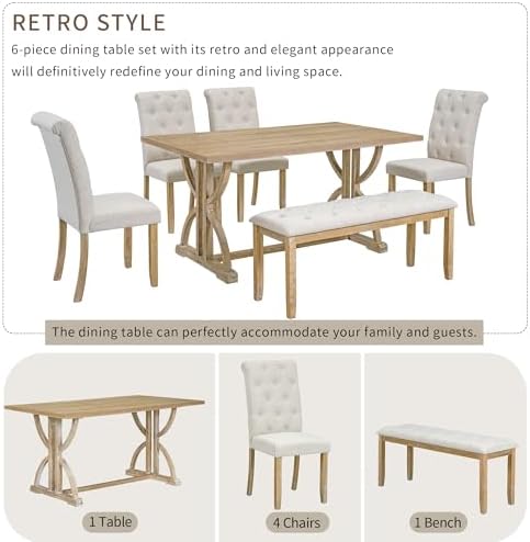 **Merax 6-Piece Wood Dining Table Set with Bench – Retro Rectangular Table with Unique Legs and 4 Upholstered Chairs & 1 Bench for Dining Room and Kitchen (Natural Wood Wash + Beige)**